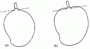 Figure 1: There is no sure way to know when mangoes are ready for harvest. One of many methods is this: in immature fruit, the shoulders are below the level of attachment of the stem (a); in mature fruit, the shoulders have risen above the stem-attachment level (b). This method does not apply to all the cultivars and must be considered with other factors