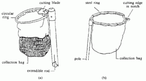 Figure 2: Picking poles are used to harvest mangoes which cannot be reached from the ground or ladder. Both the factory-made (a) and home-made (b) types have cutting device and a catching bag