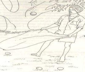 Mango-picker in the tree drops the fruit, and catcher breaks its fall using a jute sack supported by his hands and one foot. He then lowers the bag to ground level and the mango rolls out without damage